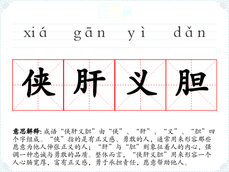 成语“侠肝义胆”由“侠”、“肝”、“义”、“胆”四个字组成。“侠”指的是有正义感、勇敢的人,通常用来形容那些愿意为他人伸张正义的人;“肝”与“胆”则象征着人的内心,强调一种忠诚与勇敢的品质。整体而言,“侠肝义胆”用来形容一个人心肠宽厚,富有正义感,勇于承担责任,愿意帮助他人。