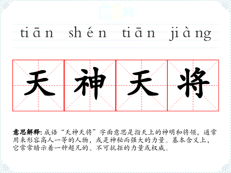 “天神天将”带给我一种崇高和敬畏的感觉。它让我联想到那些在历史上或生活中具有巨大影响力的人物,激励我们追求卓越与非凡。同时,这个成语也提醒我们,身处社会之中,领导与权威并非永恒,需以谦卑与责任心来对待。