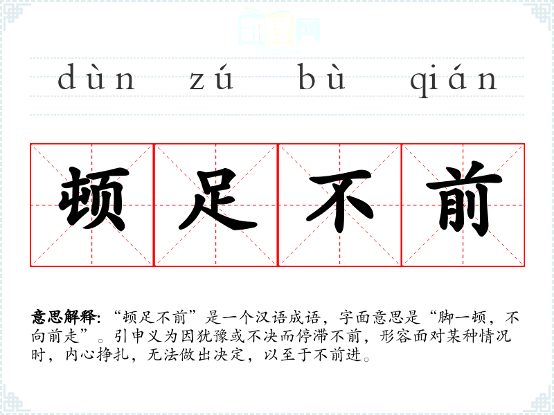 “顿足不前”是一个汉语成语,字面意思是“脚一顿,不向前走”。引申义为因犹豫或不决而停滞不前,形容面对某种情况时,内心挣扎,无法做出决定,以至于不前进。