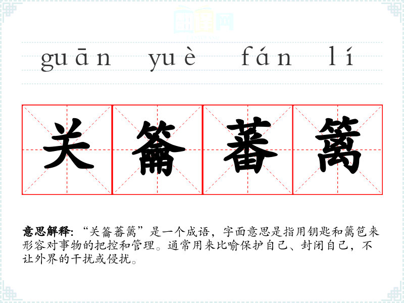 “关籥蕃篱”是一个成语,字面意思是指用钥匙和篱笆来形容对事物的把控和管理。通常用来比喻保护自己、封闭自己,不让外界的干扰或侵扰。