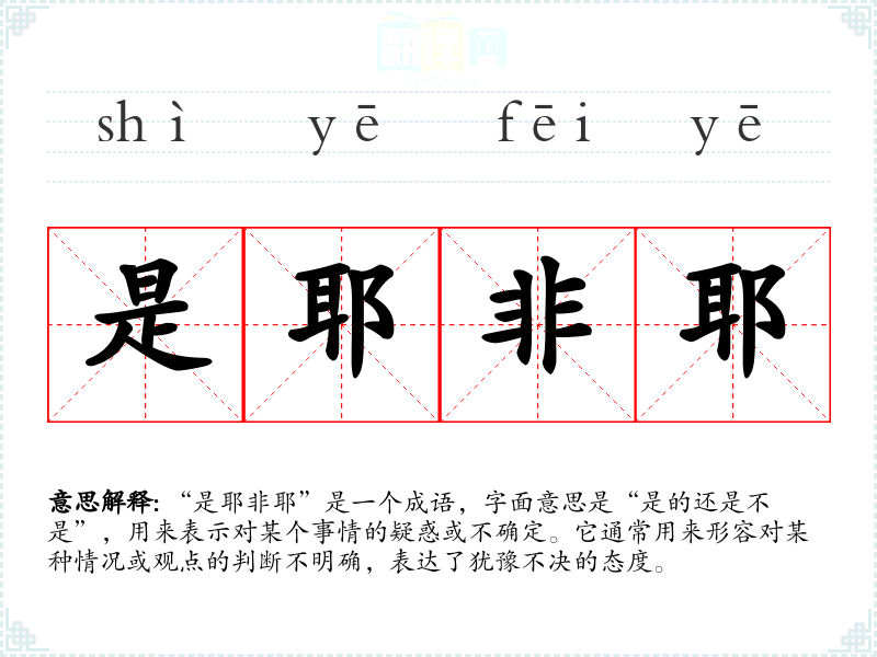“是耶非耶”是一个成语,字面意思是“是的还是不是”,用来表示对某个事情的疑惑或不确定。它通常用来形容对某种情况或观点的判断不明确,表达了犹豫不决的态度。