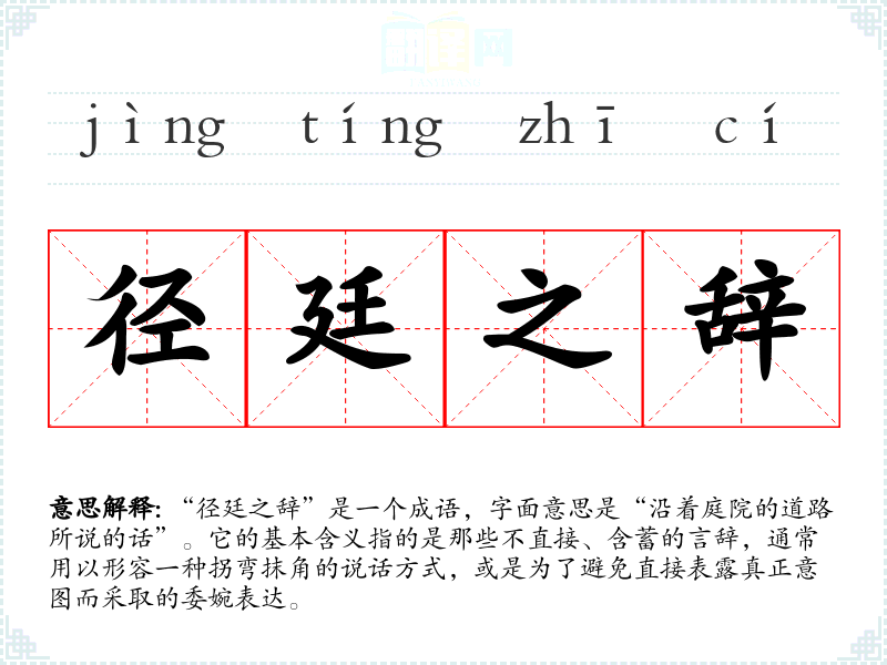 “径廷之辞”是一个成语,字面意思是“沿着庭院的道路所说的话”。它的基本含义指的是那些不直接、含蓄的言辞,通常用以形容一种拐弯抹角的说话方式,或是为了避免直接表露真正意图而采取的委婉表达。
