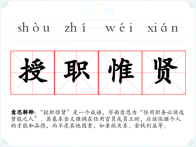 “授职惟贤”是一个成语,字面意思为“任用职务必须选贤能之人”。其基本含义强调在任用官员或员工时,应该依据个人的才能和品德,而不是其他因素,如亲疏关系、金钱利益等。