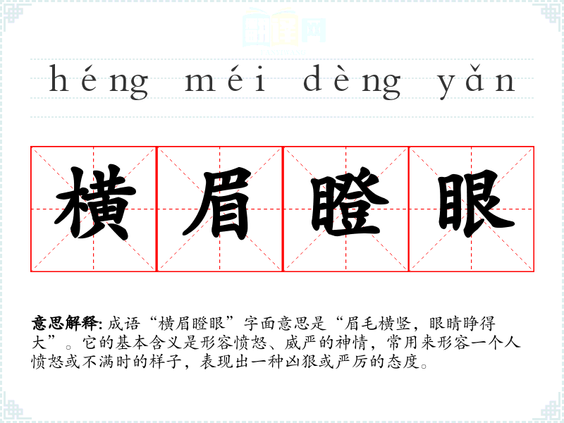 成语“横眉瞪眼”字面意思是“眉毛横竖,眼睛睁得大”。它的基本含义是形容愤怒、威严的神情,常用来形容一个人愤怒或不满时的样子,表现出一种凶狠或严厉的态度。