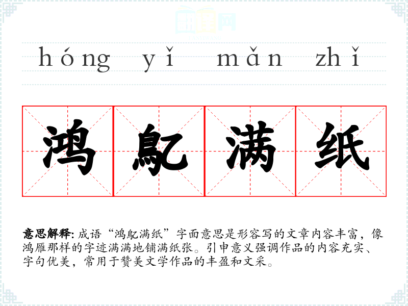 成语“鸿鳦满纸”字面意思是形容写的文章内容丰富,像鸿雁那样的字迹满满地铺满纸张。引申意义强调作品的内容充实、字句优美,常用于赞美文学作品的丰盈和文采。