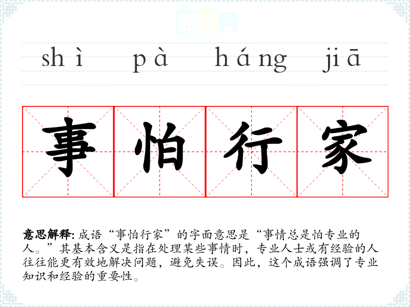 成语“事怕行家”的字面意思是“事情总是怕专业的人。”其基本含义是指在处理某些事情时,专业人士或有经验的人往往能更有效地解决问题,避免失误。因此,这个成语强调了专业知识和经验的重要性。