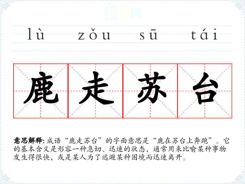 成语“鹿走苏台”的字面意思是“鹿在苏台上奔跑”。它的基本含义是形容一种急切、迅速的状态,通常用来比喻某种事物发生得很快,或是某人为了逃避某种困境而迅速离开。