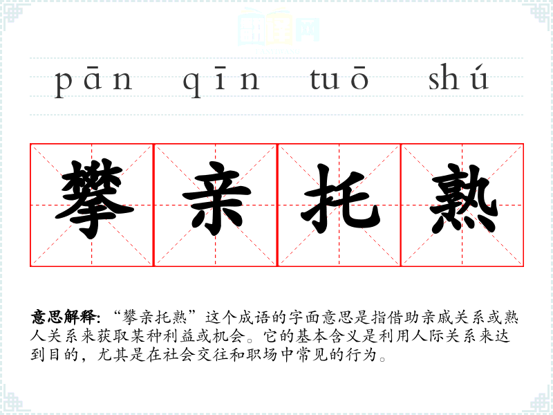 “攀亲托熟”这个成语的字面意思是指借助亲戚关系或熟人关系来获取某种利益或机会。它的基本含义是利用人际关系来达到目的,尤其是在社会交往和职场中常见的行为。