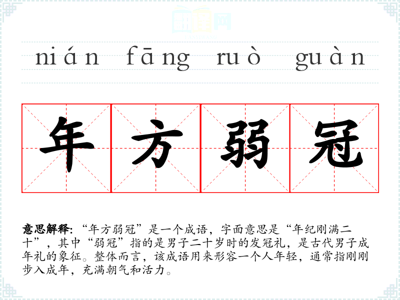 “年方弱冠”是一个成语,字面意思是“年纪刚满二十”,其中“弱冠”指的是男子二十岁时的发冠礼,是古代男子成年礼的象征。整体而言,该成语用来形容一个人年轻,通常指刚刚步入成年,充满朝气和活力。