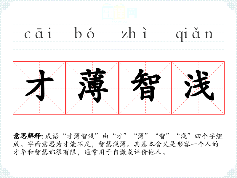 成语“才智浅”由“才”“”“智”“浅”四个字组成。字面意思为才能不足,智慧浅*。其基本含义是形容一个人的才华和智慧都很有限,通常用于自谦或评价他人。