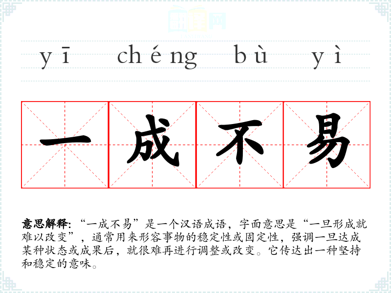 “一成不易”是一个汉语成语,字面意思是“一旦形成就难以改变”,通常用来形容事物的稳定性或固定性,强调一旦达成某种状态或成果后,就很难再进行调整或改变。它传达出一种坚持和稳定的意味。