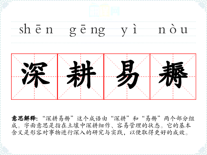 “深耕易耨”这个成语由“深耕”和“易耨”两个部分组成。字面意思是指在土壤中深耕细作、容易管理的状态。它的基本含义是形容对事物进行深入的研究与实践,以便取得更好的成效。