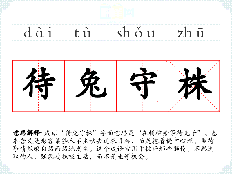 成语“待兔守株”字面意思是“在树桩旁等待兔子”。基本含义是形容某些人不主动去追求目标,而是抱着侥幸心理,期待事情能够自然而然地发生。这个成语常用于批评那些懒惰、不思进取的人,强调要积极主动,而不是坐等机会。
