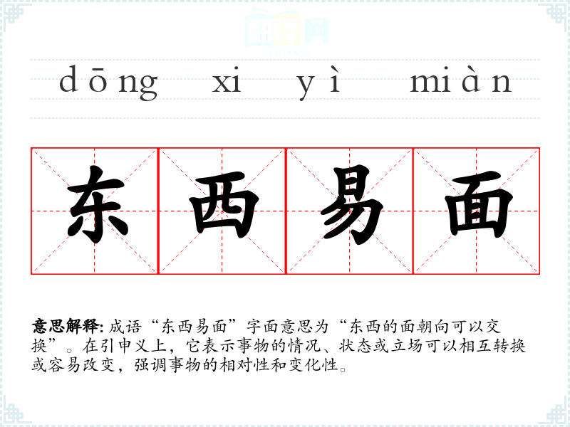 成语“东西易面”字面意思为“东西的面朝向可以交换”。在引申义上,它表示事物的情况、状态或立场可以相互转换或容易改变,强调事物的相对性和变化性。