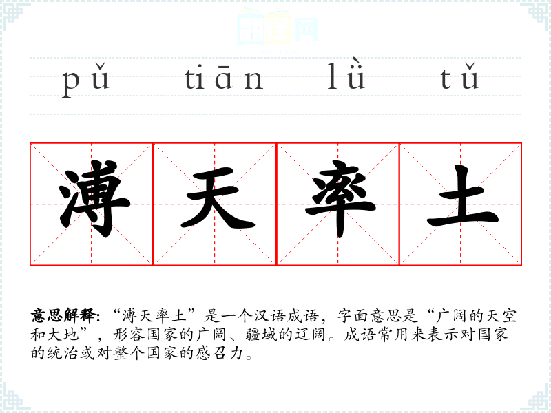 “溥天率土”是一个汉语成语,字面意思是“广阔的天空和大地”,形容国家的广阔、疆域的辽阔。成语常用来表示对国家的统治或对整个国家的感召力。