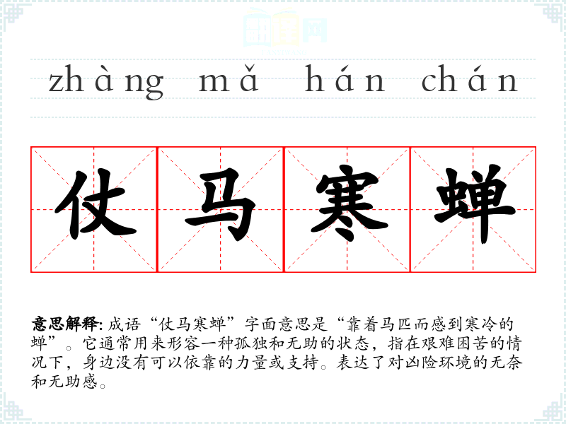 成语“仗马寒蝉”字面意思是“靠着马匹而感到寒冷的蝉”。它通常用来形容一种孤独和无助的状态,指在艰难困苦的情况下,身边没有可以依靠的力量或支持。表达了对凶险环境的无奈和无助感。