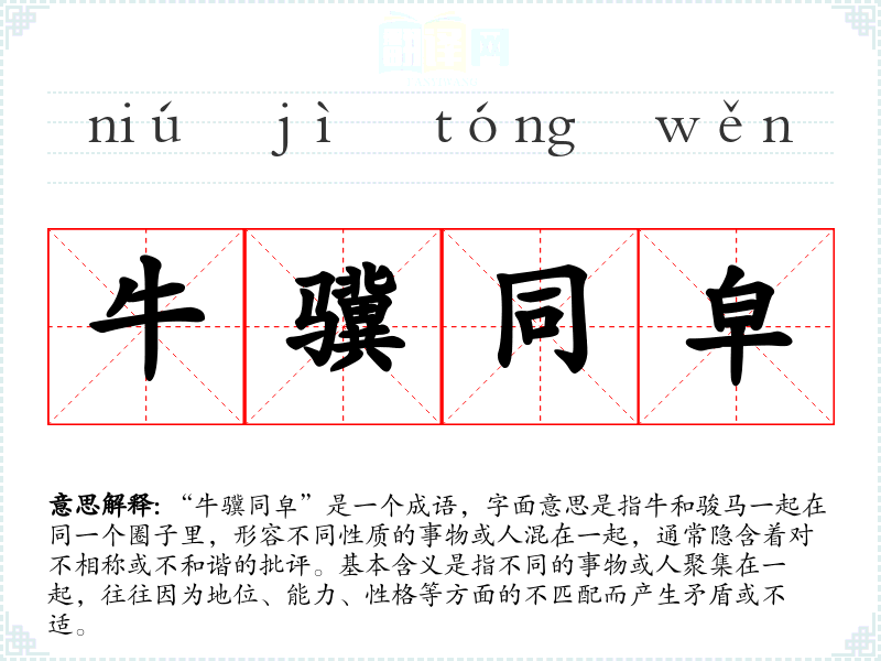 “牛骥同皁”是一个成语,字面意思是指牛和骏马一起在同一个圈子里,形容不同性质的事物或人混在一起,通常隐含着对不相称或不和谐的批评。基本含义是指不同的事物或人聚集在一起,往往因为地位、能力、性格等方面的不匹配而产生矛盾或不适。