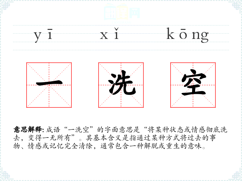 成语“一洗空”的字面意思是“将某种状态或情感彻底洗去,变得一无所有”。其基本含义是指通过某种方式将过去的事物、情感或记忆完全清除,通常包含一种解脱或重生的意味。
