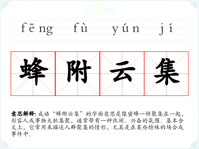 - 日常对话:在朋友聚会或活动中,可以用“蜂附云集”来形容参与人数众多,气氛热烈。