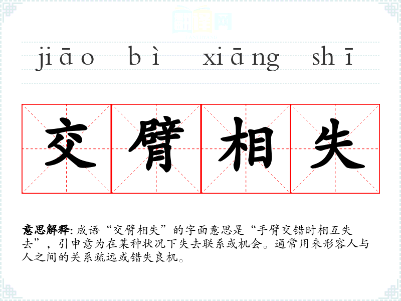 成语“交臂相失”的字面意思是“手臂交错时相互失去”,引申意为在某种状况下失去联系或机会。通常用来形容人与人之间的关系疏远或错失良机。