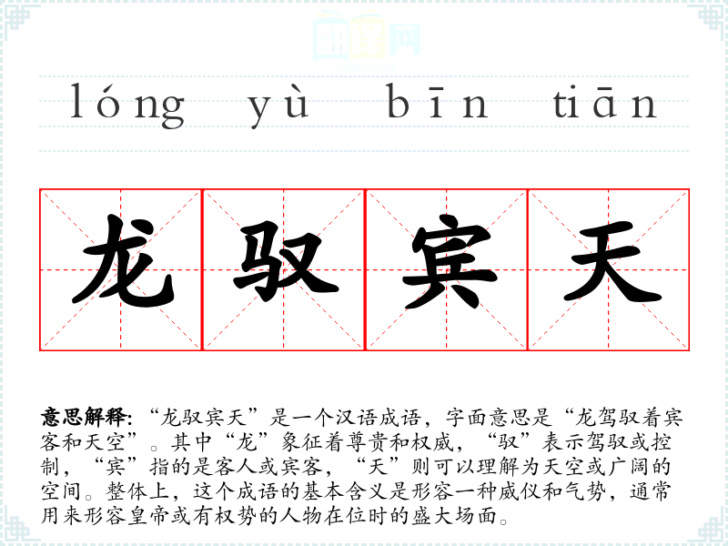 “龙驭宾天”是一个汉语成语,字面意思是“龙驾驭着宾客和天空”。其中“龙”象征着尊贵和权威,“驭”表示驾驭或控制,“宾”指的是客人或宾客,“天”则可以理解为天空或广阔的空间。整体上,这个成语的基本含义是形容一种威仪和气势,通常用来形容**或有权势的人物在位时的盛大场面。