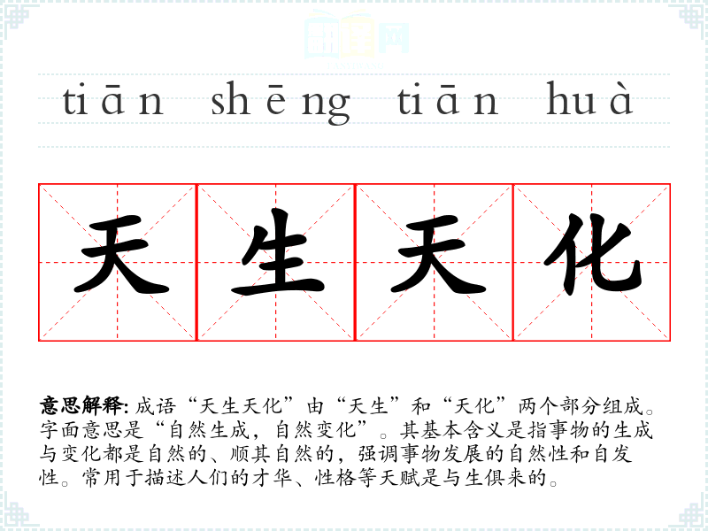 成语“天生天化”由“天生”和“天化”两个部分组成。字面意思是“自然生成,自然变化”。其基本含义是指事物的生成与变化都是自然的、顺其自然的,强调事物发展的自然性和自发性。常用于描述人们的才华、性格等天赋是与生俱来的。