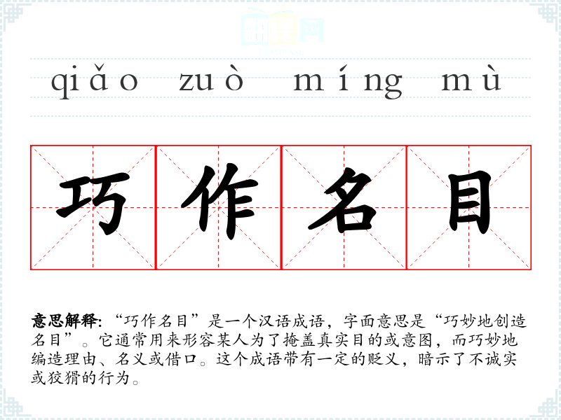“巧作名目”是一个汉语成语,字面意思是“巧妙地创造名目”。它通常用来形容某人为了掩盖真实目的或意图,而巧妙地编造理由、名义或借口。这个成语带有一定的贬义,暗示了不诚实或狡猾的行为。