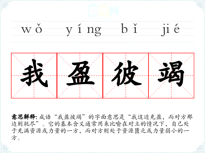 成语“我盈彼竭”的字面意思是“我这边充盈,而对方那边则耗尽”。它的基本含义通常用来比喻在对立的情况下,自己处于充满资源或力量的一方,而对方则处于资源匮乏或力量弱小的一方。