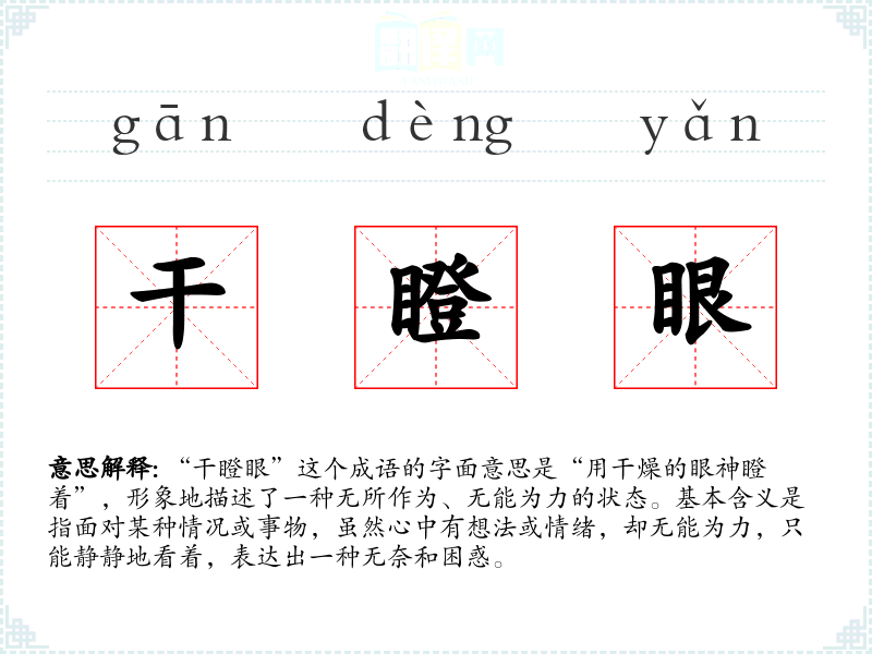 “干瞪眼”可能源于民间口语,具体的历史背景并不明确。但它反映了一种常见的情感状态,即在某些情况下,人们虽然有想法或愿望,却因某种原因无法采取行动。成语的使用在现代汉语中较为普遍,逐渐成为一种表达无奈、无力感的固定说法。