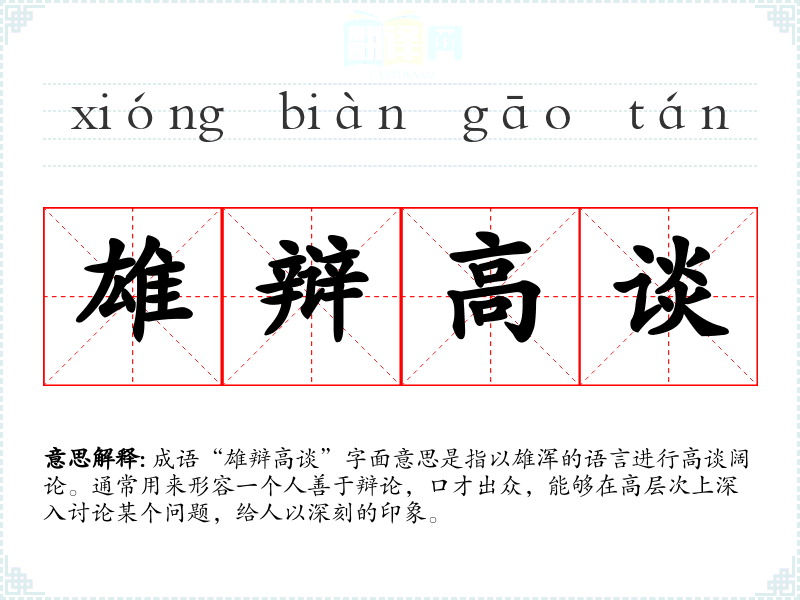成语“雄辩高谈”字面意思是指以雄浑的语言进行高谈阔论。通常用来形容一个人善于辩论,口才出众,能够在高层次上深入讨论某个问题,给人以深刻的印象。