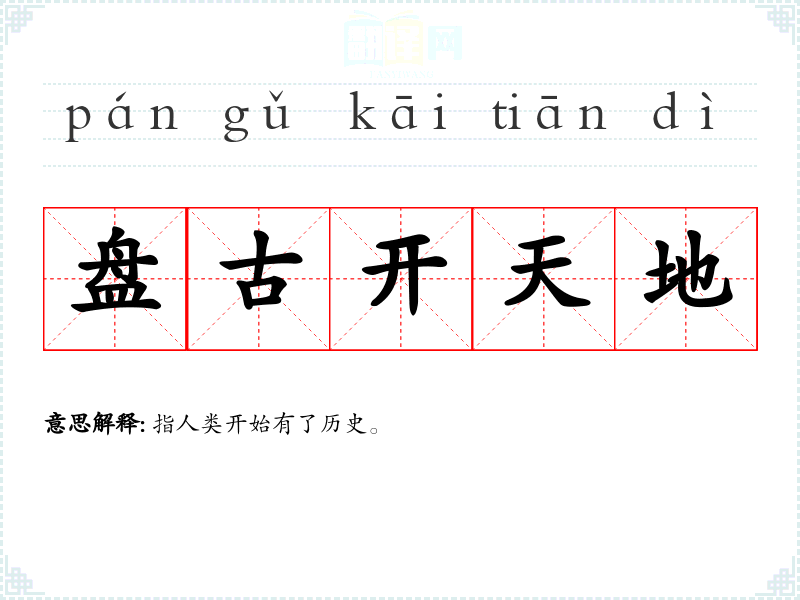 | 一画开天 | 相传伏羲画八卦,始于干卦三之第一画,干为天,故指“一画开天”。 |