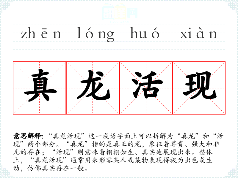 “真龙活现”这一成语字面上可以拆解为“真龙”和“活现”两个部分。“真龙”指的是真正的龙,象征着尊贵、强大和非凡的存在;“活现”则意味着栩栩如生、真实地展现出来。整体上,“真龙活现”通常用来形容某人或某物表现得极为出色或生动,仿佛真实存在一般。