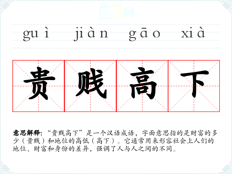 “贵贱高下”是一个汉语成语,字面意思指的是财富的多少(贵贱)和地位的高低(高下)。它通常用来形容社会上人们的地位、财富和身份的差异,强调了人与人之间的不同。