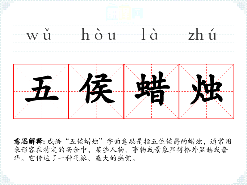 成语“五侯蜡烛”字面意思是指五位侯爵的蜡烛,通常用来形容在特定的场合中,某些人物、事物或景象显得格外显赫或奢华。它传达了一种气派、盛大的感觉。
