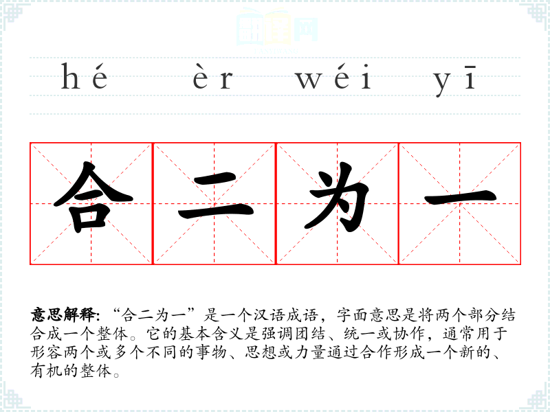 “合二为一”是一个汉语成语,字面意思是将两个部分结合成一个整体。它的基本含义是强调团结、统一或协作,通常用于形容两个或多个不同的事物、思想或力量通过合作形成一个新的、有机的整体。