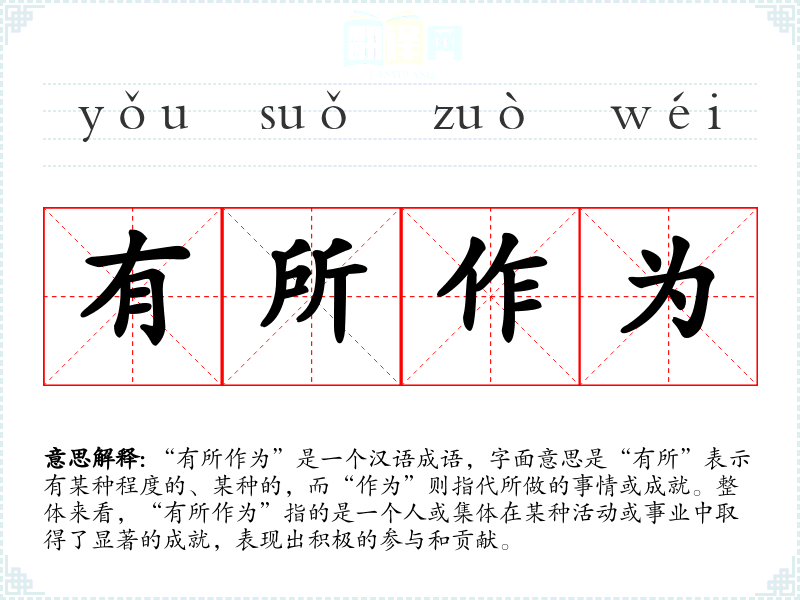 “有所作为”是一个汉语成语,字面意思是“有所”表示有某种程度的、某种的,而“作为”则指代所做的事情或成就。整体来看,“有所作为”指的是一个人或集体在某种活动或事业中取得了显著的成就,表现出积极的参与和贡献。
