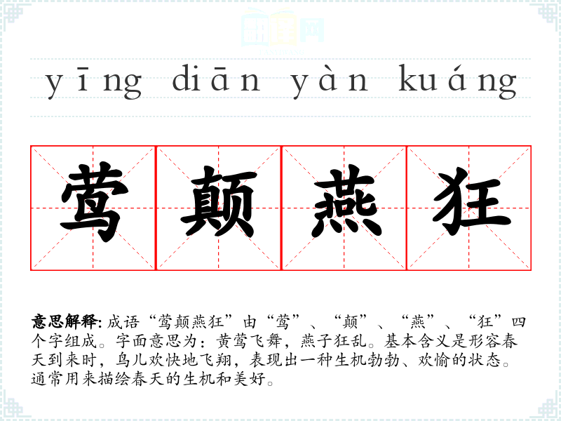 成语“莺颠燕狂”由“莺”、“颠”、“燕”、“狂”四个字组成。字面意思为:黄莺飞舞,燕子狂乱。基本含义是形容春天到来时,鸟儿欢快地飞翔,表现出一种生机勃勃、欢愉的状态。通常用来描绘春天的生机和美好。