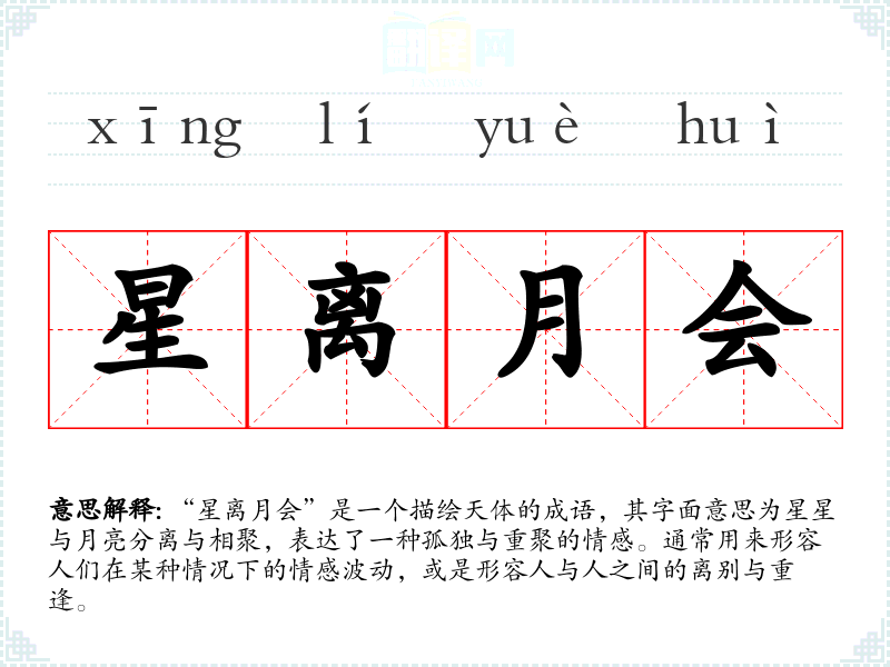 “星离月会”是一个描绘天体的成语,其字面意思为星星与月亮分离与相聚,表达了一种孤独与重聚的情感。通常用来形容人们在某种情况下的情感波动,或是形容人与人之间的离别与重逢。