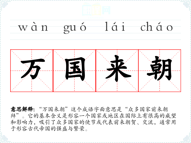 “万国来朝”这个成语字面意思是“众多国家前来朝拜”。它的基本含义是形容一个国家或地区在国际上有很高的威望和影响力,吸引了众多国家的使节或代表前来朝贺、交流,通常用于形容古代帝国的强盛与繁荣。
