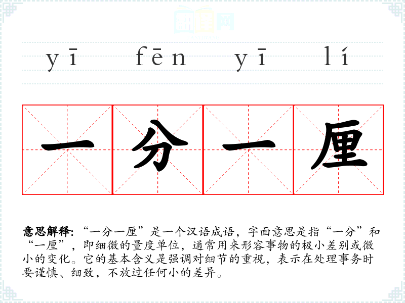“一分一厘”是一个汉语成语,字面意思是指“一分”和“一厘”,即细微的量度单位,通常用来形容事物的极小差别或微小的变化。它的基本含义是强调对细节的重视,表示在处理事务时要谨慎、细致,不放过任何小的差异。