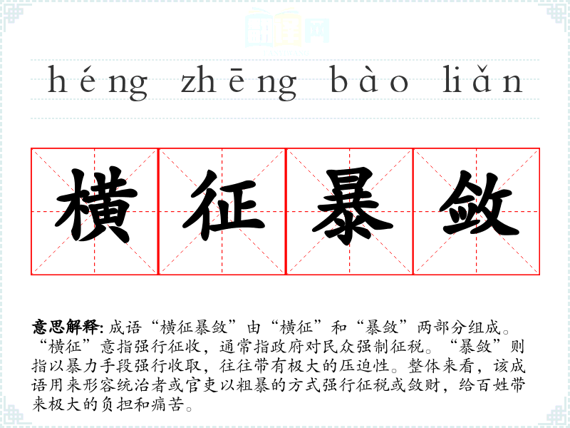 成语“横征暴敛”由“横征”和“暴敛”两部分组成。“横征”意指强行征收,通常指政府对民众强制征税。“暴敛”则指以暴力手段强行收取,往往带有极大的压迫性。整体来看,该成语用来形容统治者或官吏以粗暴的方式强行征税或敛财,给百姓带来极大的负担和痛苦。