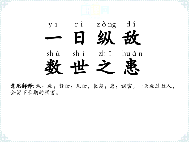 纵:放;万世:长期;患:祸害。一天放过敌人,会留下长期的祸害。 |
