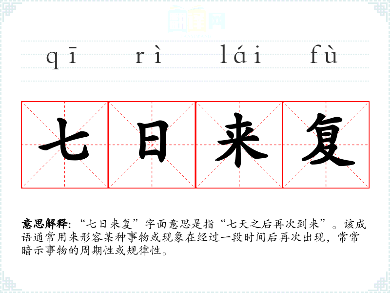“七日来复”字面意思是指“七天之后再次到来”。该成语通常用来形容某种事物或现象在经过一段时间后再次出现,常常暗示事物的周期性或规律性。