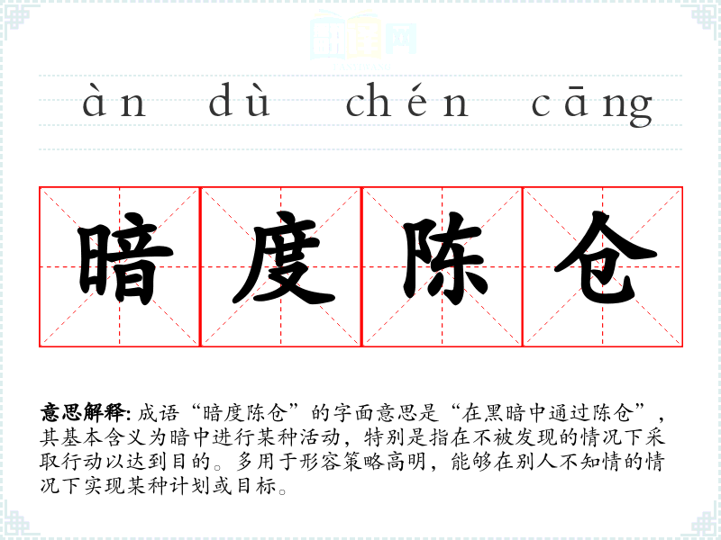 成语“暗度陈仓”的字面意思是“在黑暗中通过陈仓”,其基本含义为暗中进行某种活动,特别是指在不被发现的情况下采取行动以达到目的。多用于形容策略高明,能够在别人不知情的情况下实现某种计划或目标。