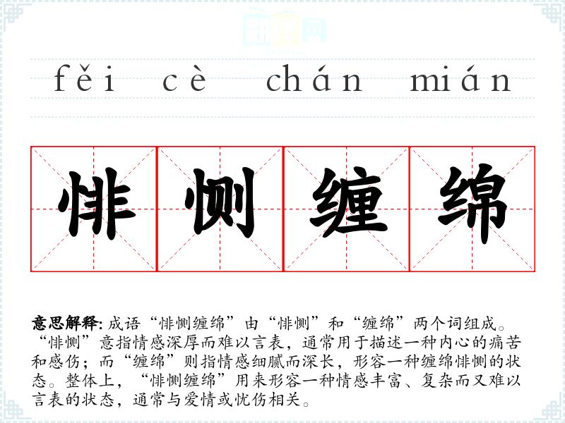 | 悱恻缠绵 | 心绪悲苦而不能排遣。 |