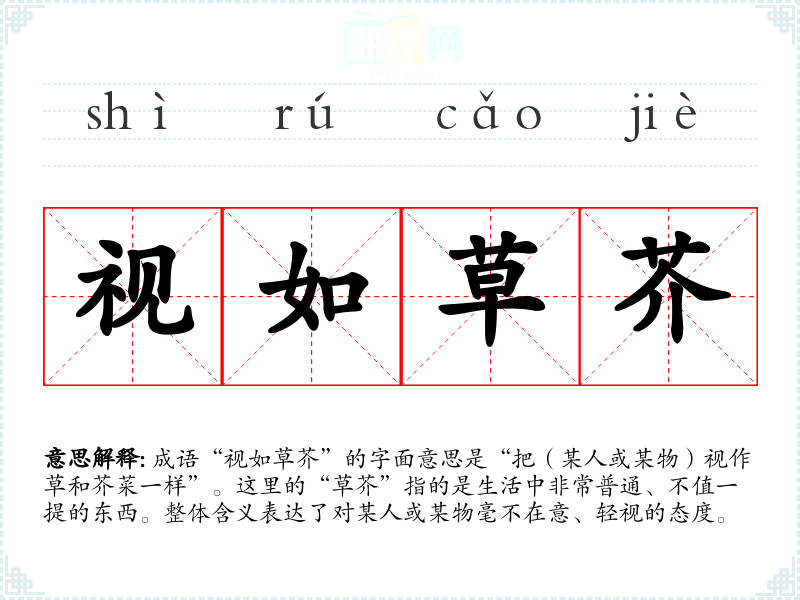 成语“视如草芥”的字面意思是“把(某人或某物)视作草和芥菜一样”。这里的“草芥”指的是生活中非常普通、不值一提的东西。整体含义表达了对某人或某物毫不在意、轻视的态度。