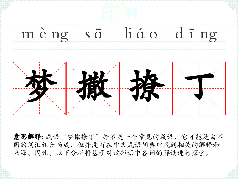 成语“梦撒撩丁”并不是一个常见的成语,它可能是由不同的词汇组合而成,但并没有在中文成语词典中找到相关的解释和来源。因此,以下分析将基于对该短语中各词的解读进行探索。