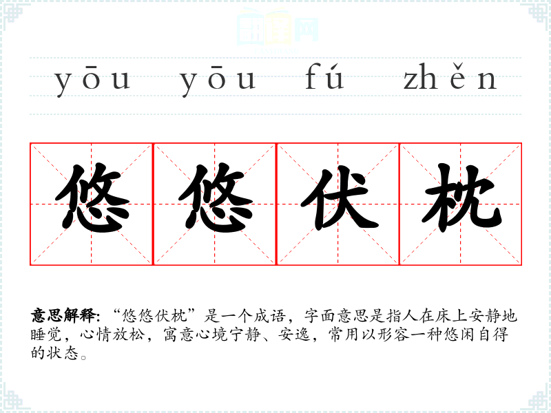 “悠悠伏枕”是一个成语,字面意思是指人在床上安静地睡觉,心情放松,寓意心境宁静、安逸,常用以形容一种悠闲自得的状态。