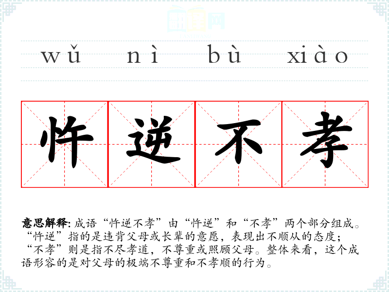 成语“忤逆不孝”由“忤逆”和“不孝”两个部分组成。“忤逆”指的是违背父母或长辈的意愿,表现出不顺从的态度;“不孝”则是指不尽孝道,不尊重或照顾父母。整体来看,这个成语形容的是对父母的极端不尊重和不孝顺的行为。