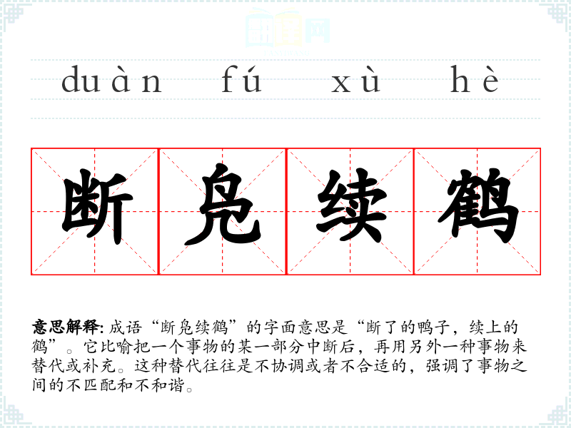 - 反义成语:天衣无缝、和谐美满。这些成语传达的是事物之间的和谐与完美,正好与“断凫续鹤”形成对比。